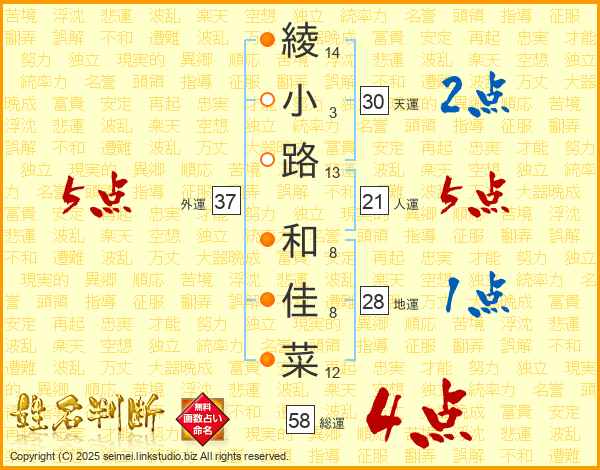 綾(14画)小(3画)路(13画) 和(8画)佳(8画)菜(12画)