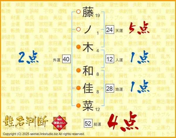 藤ノ木和佳菜さんの総運は52画の4点!