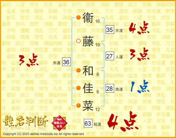 衞(16画)藤(19画) 和(8画)佳(8画)菜(12画)