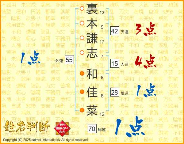 裏(13画)本(5画)謙(17画)志(7画) 和(8画)佳(8画)菜(12画)