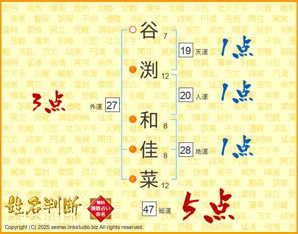 谷(7画)渕(12画) 和(8画)佳(8画)菜(12画)