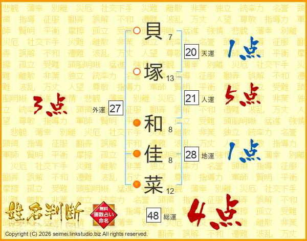 貝(7画)塚(13画) 和(8画)佳(8画)菜(12画)