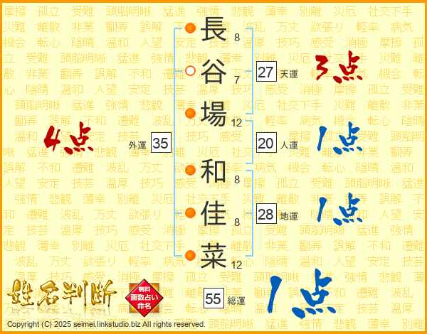 長(8画)谷(7画)場(12画) 和(8画)佳(8画)菜(12画)
