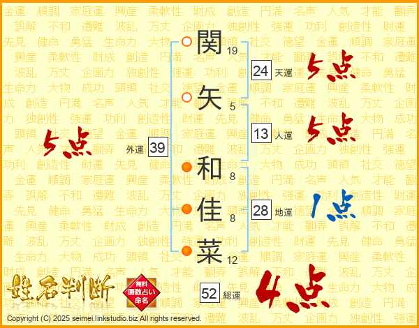 関(19画)矢(5画) 和(8画)佳(8画)菜(12画)