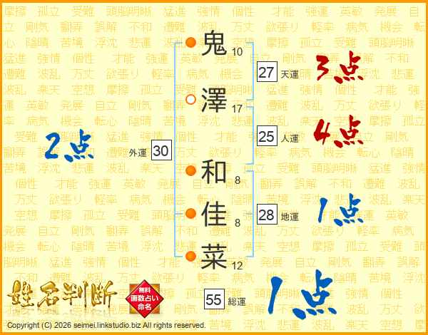 鬼(10画)澤(17画) 和(8画)佳(8画)菜(12画)