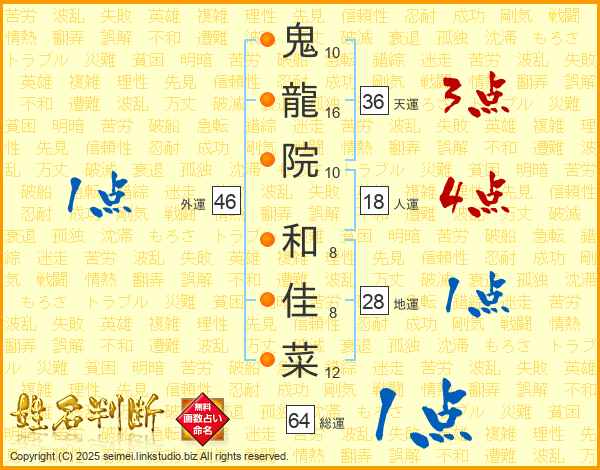 鬼(10画)龍(16画)院(10画) 和(8画)佳(8画)菜(12画)