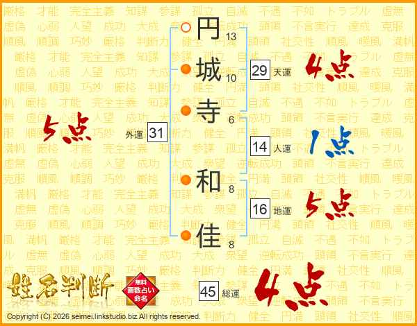 円(13画)城(10画)寺(6画) 和(8画)佳(8画)