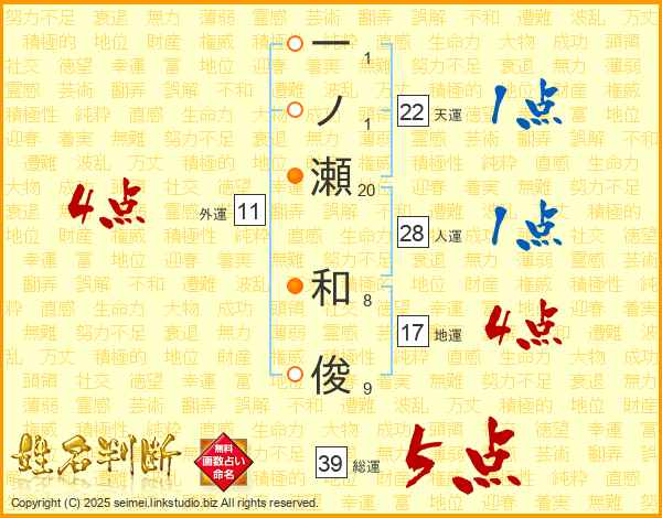 一ノ瀬和俊さんの総運は39画の5点!