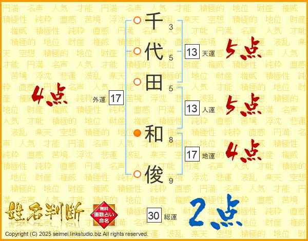 千代田和俊さんの人運は13画の5点!