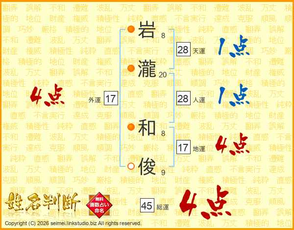 岩(8画)瀧(20画) 和(8画)俊(9画)