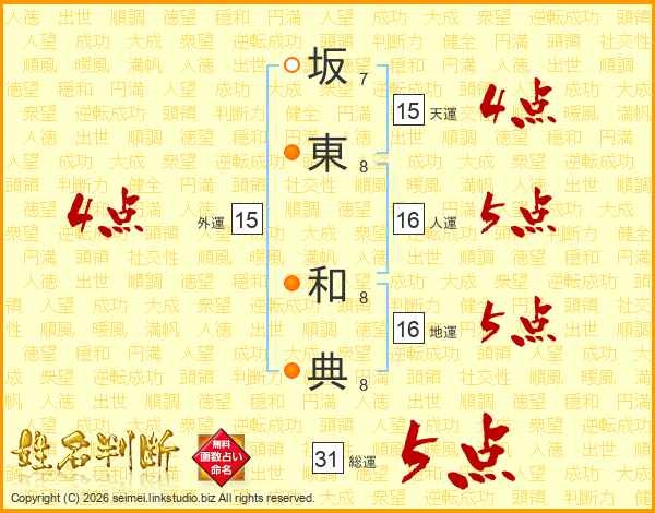 生活面を象徴する運勢です。外部から受ける影響力を表し、結婚運、家庭運や職場、環境への順応性を表します。総運から人運を引いた画数。姓や名が1文字の場合を除く。