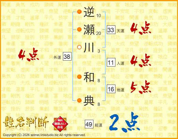 逆瀬川和典さんの総運は49画の2点!