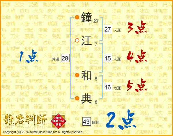 生活面を象徴する運勢です。外部から受ける影響力を表し、結婚運、家庭運や職場、環境への順応性を表します。総運から人運を引いた画数。姓や名が1文字の場合を除く。