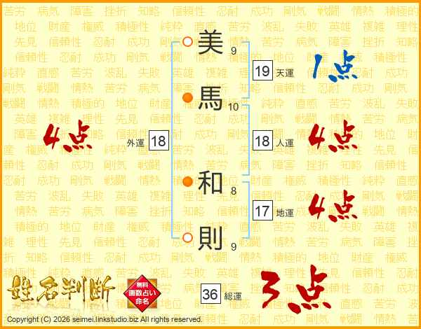 生活面を象徴する運勢です。外部から受ける影響力を表し、結婚運、家庭運や職場、環境への順応性を表します。総運から人運を引いた画数。姓や名が1文字の場合を除く。