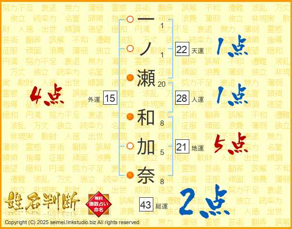 一(1画)ノ(1画)瀬(20画) 和(8画)加(5画)奈(8画)