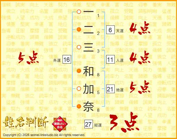生活面を象徴する運勢です。外部から受ける影響力を表し、結婚運、家庭運や職場、環境への順応性を表します。総運から人運を引いた画数。姓や名が1文字の場合を除く。