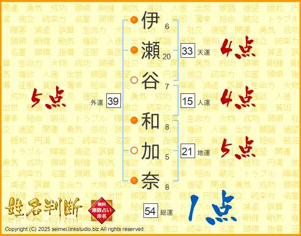 伊(6画)瀬(20画)谷(7画) 和(8画)加(5画)奈(8画)