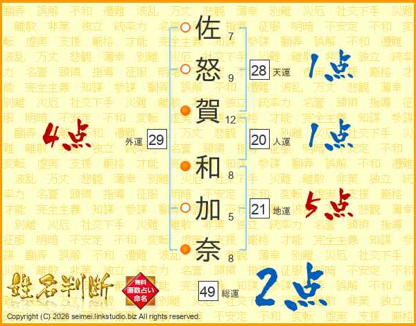 佐怒賀和加奈さんの総運は49画の2点!