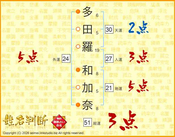 多(6画)田(5画)羅(19画) 和(8画)加(5画)奈(8画)