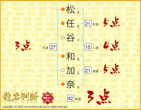 松(8画)任(6画)谷(7画) 和(8画)加(5画)奈(8画)