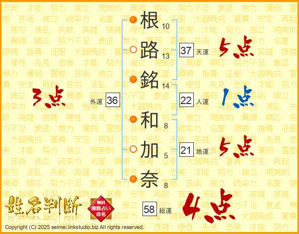 根(10画)路(13画)銘(14画) 和(8画)加(5画)奈(8画)