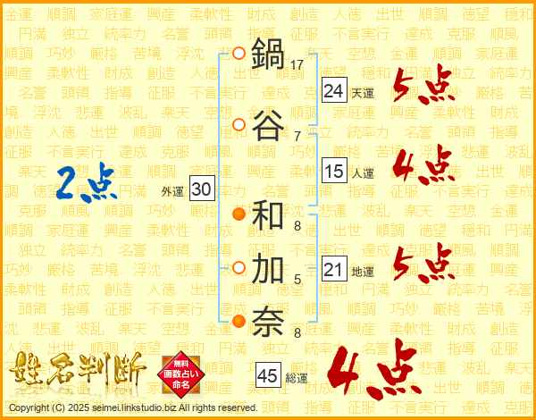 鍋(17画)谷(7画) 和(8画)加(5画)奈(8画)