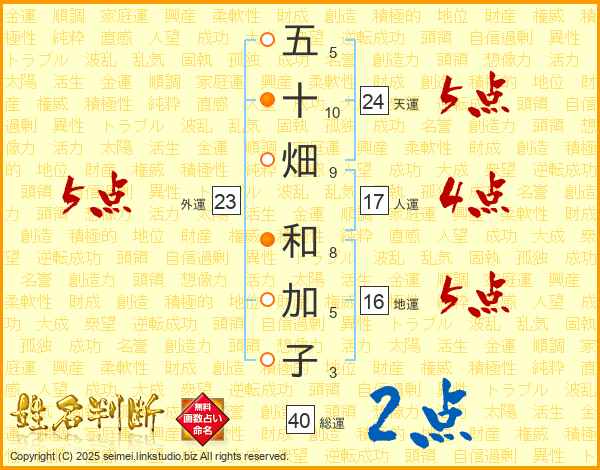 五(5画)十(10画)畑(9画) 和(8画)加(5画)子(3画)