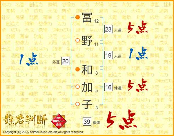 冨(12画)野(11画) 和(8画)加(5画)子(3画)