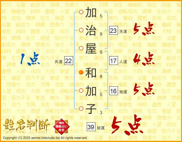 加治屋和加子さんの総運は39画の5点!