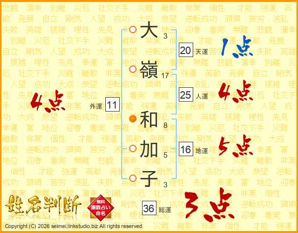 大(3画)嶺(17画) 和(8画)加(5画)子(3画)