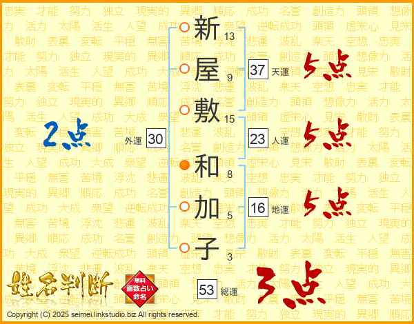 新(13画)屋(9画)敷(15画) 和(8画)加(5画)子(3画)