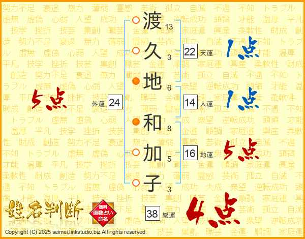 渡(13画)久(3画)地(6画) 和(8画)加(5画)子(3画)