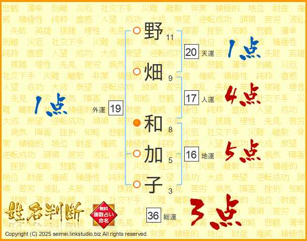 野畑和加子さんの総運は36画の3点!