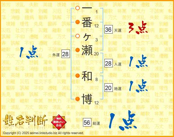 一(1画)番(12画)ヶ(3画)瀬(20画) 和(8画)博(12画)