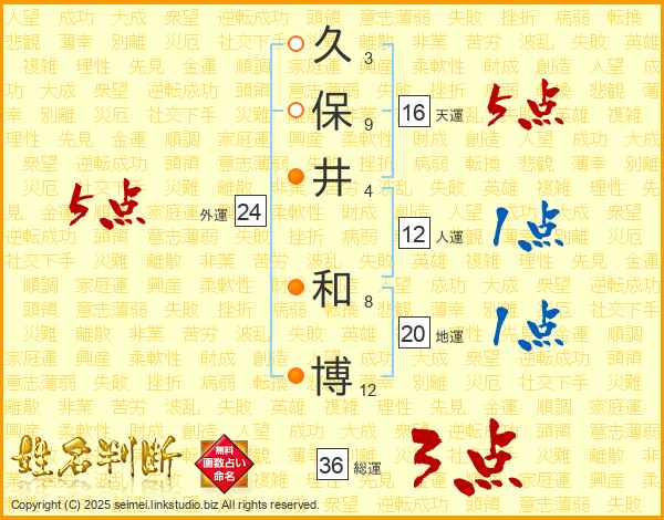 久(3画)保(9画)井(4画) 和(8画)博(12画)
