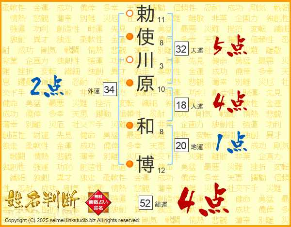 勅(11画)使(8画)川(3画)原(10画) 和(8画)博(12画)