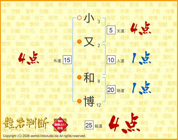 生活面を象徴する運勢です。外部から受ける影響力を表し、結婚運、家庭運や職場、環境への順応性を表します。総運から人運を引いた画数。姓や名が1文字の場合を除く。