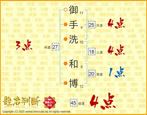 生活面を象徴する運勢です。外部から受ける影響力を表し、結婚運、家庭運や職場、環境への順応性を表します。総運から人運を引いた画数。姓や名が1文字の場合を除く。