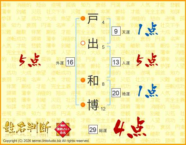 生活面を象徴する運勢です。外部から受ける影響力を表し、結婚運、家庭運や職場、環境への順応性を表します。総運から人運を引いた画数。姓や名が1文字の場合を除く。