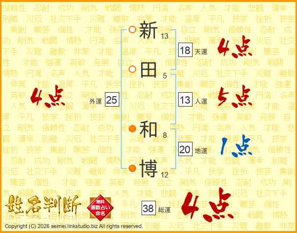 生活面を象徴する運勢です。外部から受ける影響力を表し、結婚運、家庭運や職場、環境への順応性を表します。総運から人運を引いた画数。姓や名が1文字の場合を除く。