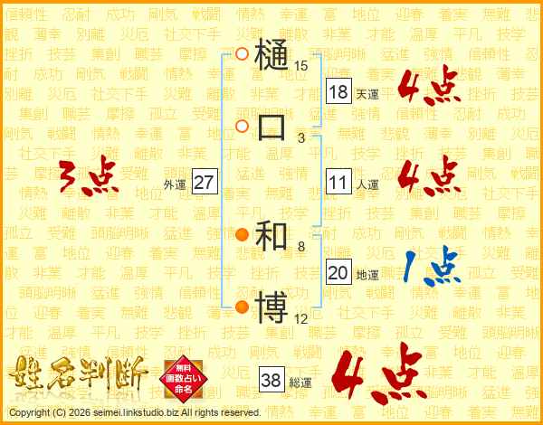 生活面を象徴する運勢です。外部から受ける影響力を表し、結婚運、家庭運や職場、環境への順応性を表します。総運から人運を引いた画数。姓や名が1文字の場合を除く。