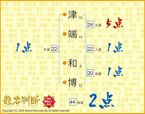 生活面を象徴する運勢です。外部から受ける影響力を表し、結婚運、家庭運や職場、環境への順応性を表します。総運から人運を引いた画数。姓や名が1文字の場合を除く。