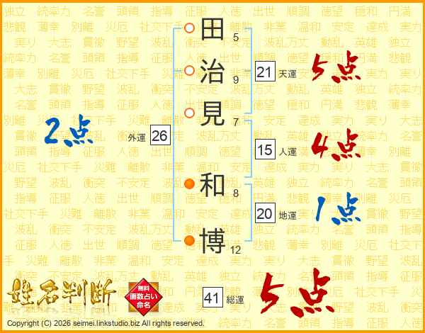 田(5画)治(9画)見(7画) 和(8画)博(12画)