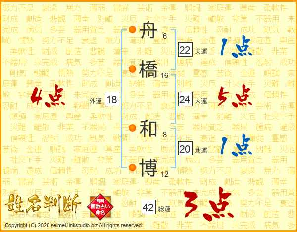 あなたの人生を表す1番重要な運勢です。生涯を通じて影響する総合運となり、主に50歳以降の晩年期に影響を及ぼします。苗字と名前の合計画数。