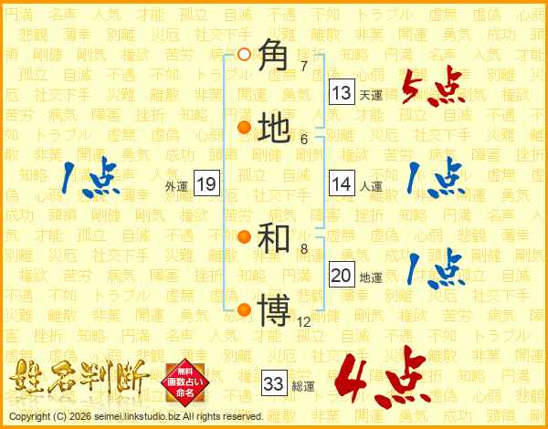 生活面を象徴する運勢です。外部から受ける影響力を表し、結婚運、家庭運や職場、環境への順応性を表します。総運から人運を引いた画数。姓や名が1文字の場合を除く。