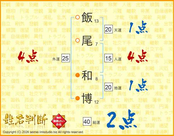 生活面を象徴する運勢です。外部から受ける影響力を表し、結婚運、家庭運や職場、環境への順応性を表します。総運から人運を引いた画数。姓や名が1文字の場合を除く。