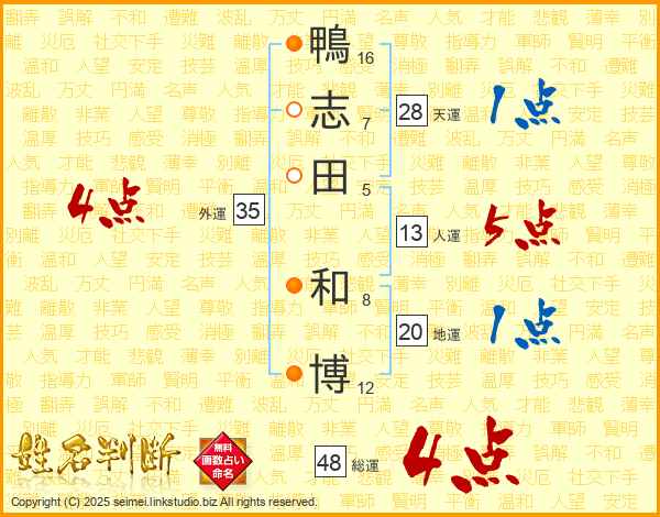 鴨(16画)志(7画)田(5画) 和(8画)博(12画)