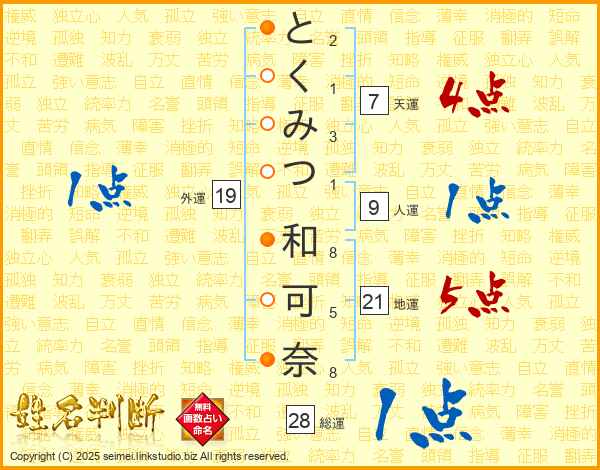 と(2画)く(1画)み(3画)つ(1画) 和(8画)可(5画)奈(8画)