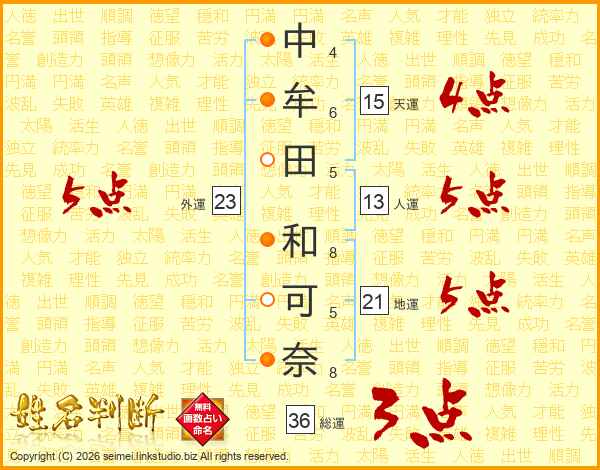 中(4画)牟(6画)田(5画) 和(8画)可(5画)奈(8画)