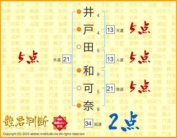 井(4画)戸(4画)田(5画) 和(8画)可(5画)奈(8画)